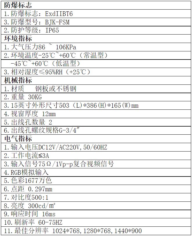 ? 主要用于石油開采、煉油、化工、醫藥、海洋石油平臺、油輪、油庫、軍工、金屬打磨拋光、糧食生產儲存等爆炸性氣體環境和爆炸性粉塵環境,作為自動化、信息化系統的顯示、監視之用;